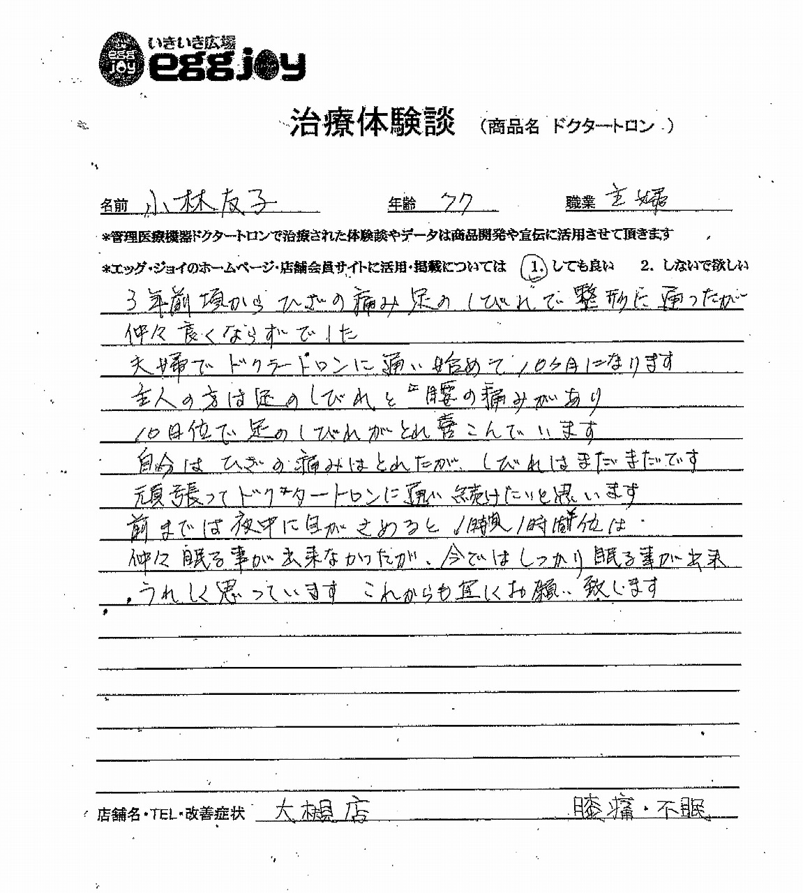 前までは夜中に目が覚めると1時間~1時間半位はなかなか眠る事が出来なかったが、今ではしっかり眠る事が出来、うれしく思っています。これからも宜しくお願い致します。