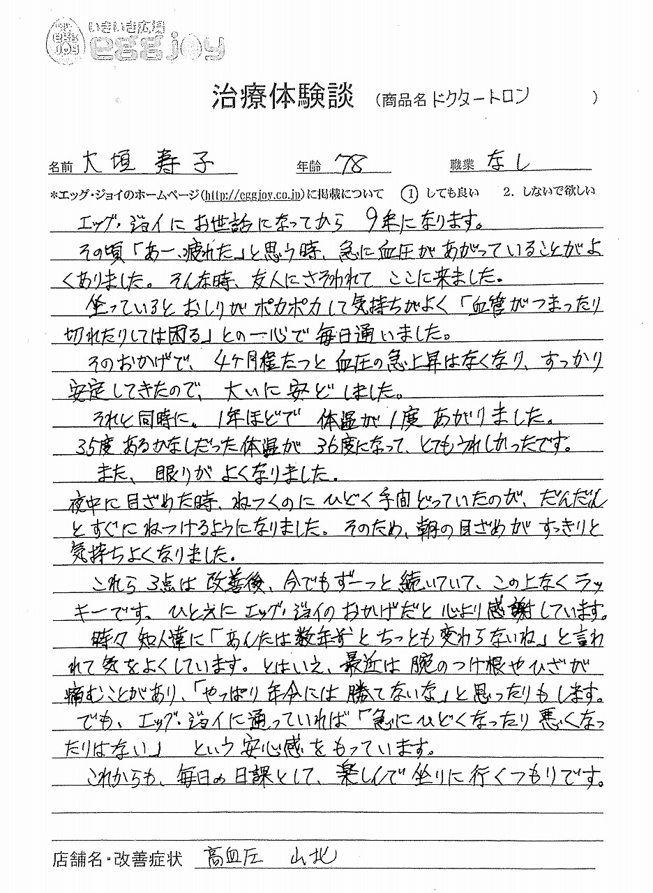 時々、知人達に「あんたは数年前とちっとも変わらないね」と言われて気を良くしています。とはいえ、最近は腕の付け根やひざが痛むことがあり、「やっぱり年齢には勝てないな」と思ったりもします。でも、エッグジョイに通っていれば、「急にひどくなったり、悪くなったりはない」という安心感をもっています。