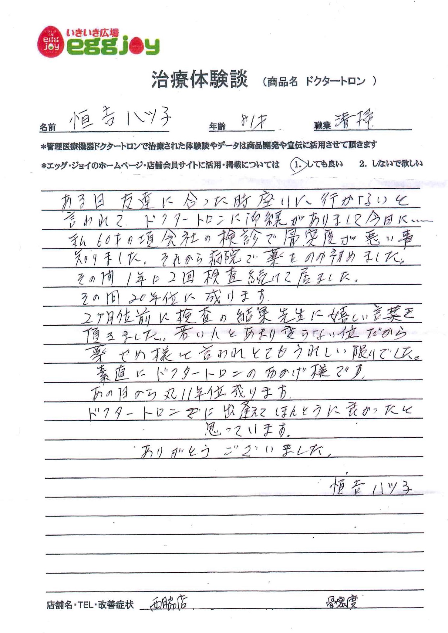 2ヶ月位前の検査の結果、先生に嬉しい言葉を頂きました。若い人とあまり変わらない位だから、薬やめようと言われ、とてもうれしい限りでした。