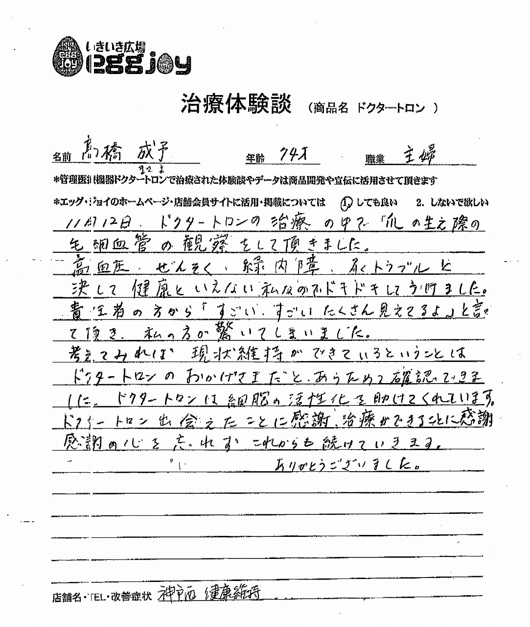 高血圧、ぜんそく、緑内障、尿トラブルと、決して健康といえない私なので、ドキドキして受けました。責任者の方から、「すごい、すごい、たくさん見えてるよ」と言って頂き、私の方が驚いてしまいました。